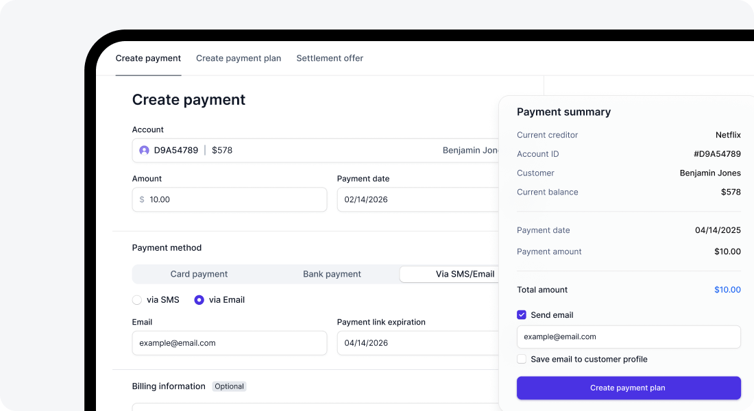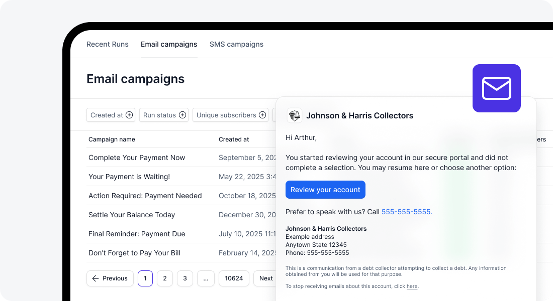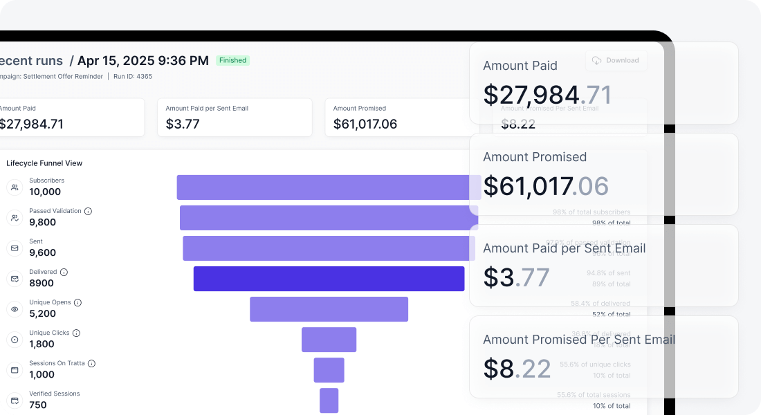 Re-engage consumers with Tratta’s personalized, fully compliant email campaigns. Track every interaction from send to settlement on one integrated dashboard. Document success with easy-to-share detailed reports.
