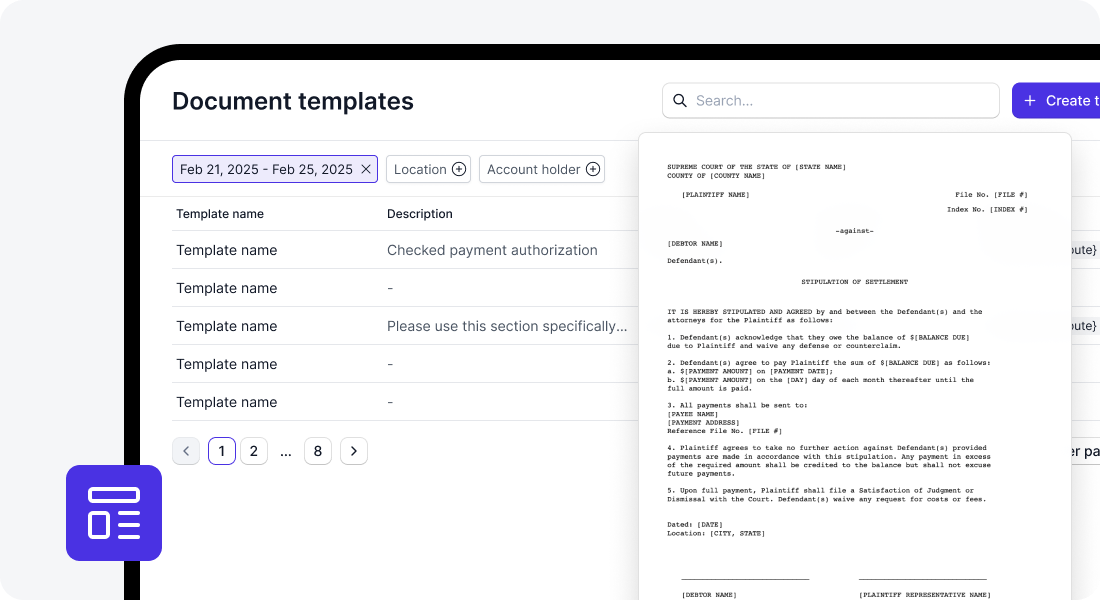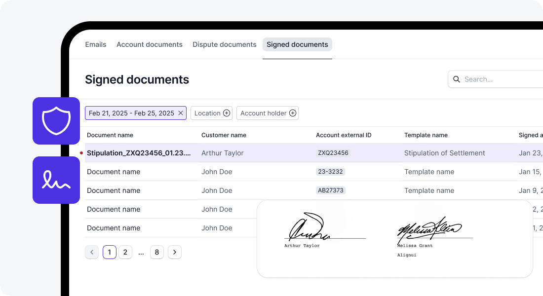 Tratta Sign embeds legally binding digital signatures directly into the Collect portal. Consumers sign consent judgments, payment agreements, and disclosure acknowledgments at checkout or login. Every signature creates a complete audit trail. No third-party contracts. No redirects.